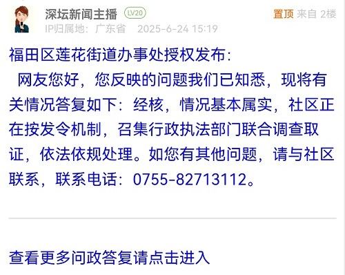 網(wǎng)友您好,您反映的問題我們已知悉,現(xiàn)將有關(guān)情況答復(fù)如下:經(jīng)核,情況基本屬實(shí),社區(qū)正在按發(fā)令機(jī)制,召集行政執(zhí)法部門聯(lián)合調(diào)查取證,依法依規(guī)處理。如您有其他問題,請與社區(qū)聯(lián)系,聯(lián)系電話:0755-82713112。