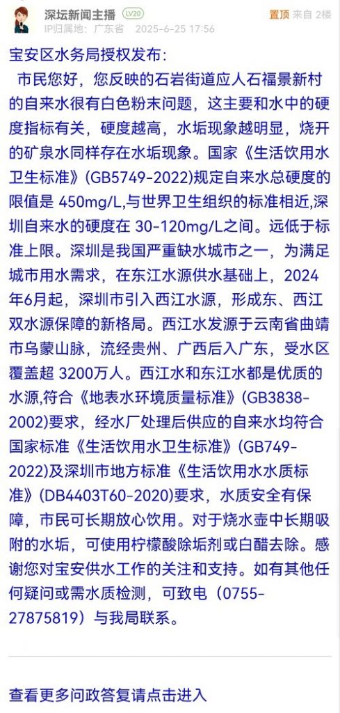 市民您好,您反映的石巖街道應(yīng)人石福景新村的自來水很有白色粉末問題,這主要和水中的硬度指標(biāo)有關(guān),硬度越高,水垢現(xiàn)象越明顯,燒開的礦泉水同樣存在水垢現(xiàn)象。國家《生活飲用水衛(wèi)生標(biāo)準(zhǔn)》(GB5749-2022)規(guī)定自來水總硬度的限值是 450mg/L,與世界衛(wèi)生組織的標(biāo)準(zhǔn)相近,深圳自來水的硬度在 30-120mg/L之間。遠(yuǎn)低于標(biāo)準(zhǔn)上限。深圳是我國嚴(yán)重缺水城市之一,為滿足城市用水需求,在東江水源供水基礎(chǔ)上,2024年6月起,深圳市引入西江水源,形成東、西江雙水源保障的新格局。西江水發(fā)源于云南省曲靖市烏蒙山脈,流經(jīng)貴州、廣西后入廣東,受水區(qū)覆蓋超 3200萬人。西江水和東江水都是優(yōu)質(zhì)的水源,符合《地表水環(huán)境質(zhì)量標(biāo)準(zhǔn)》(GB3838-2002)要求,經(jīng)水廠處理后供應(yīng)的自來水均符合國家標(biāo)準(zhǔn)《生活飲用水衛(wèi)生標(biāo)準(zhǔn)》(GB749-2022)及深圳市地方標(biāo)準(zhǔn)《生活飲用水水質(zhì)標(biāo)準(zhǔn)》(DB4403T60-2020)要求,水質(zhì)安全有保障,市民可長期放心飲用。對于燒水壺中長期吸附的水垢,可使用檸檬酸除垢劑或白醋去除。感謝您對寶安供水工作的關(guān)注和支持。如有其他任何疑問或需水質(zhì)檢測,可致電(0755-27875819)與我局聯(lián)系。