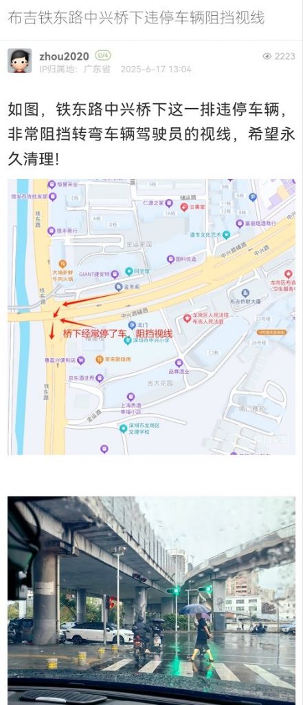 4. 帖文《布吉鐵東路中興橋下違停車輛阻擋視線》