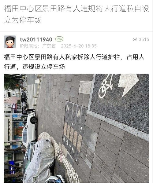 13. 帖文《福田中心區(qū)景田路有人違規(guī)將人行道私自設(shè)立為停車場》