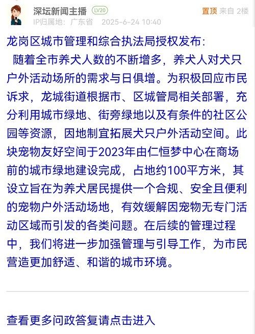 隨著全市養(yǎng)犬人數(shù)的不斷增多,養(yǎng)犬人對犬只戶外活動場所的需求與日俱增。為積極回應(yīng)市民訴求,龍城街道根據(jù)市、區(qū)城管局相關(guān)部署,充分利用城市綠地、街旁綠地以及有條件的社區(qū)公園等資源,因地制宜拓展犬只戶外活動空間。此塊寵物友好空間于2023年由仁恒夢中心在商場前的城市綠地建設(shè)完成,占地約100平方米,其設(shè)立旨在為養(yǎng)犬居民提供一個合規(guī)、安全且便利的寵物戶外活動場地,有效緩解因?qū)櫸餆o專門活動區(qū)域而引發(fā)的各類問題。在后續(xù)的管理過程中,我們將進(jìn)一步加強(qiáng)管理與引導(dǎo)工作,為市民營造更加舒適、和諧的城市環(huán)境。