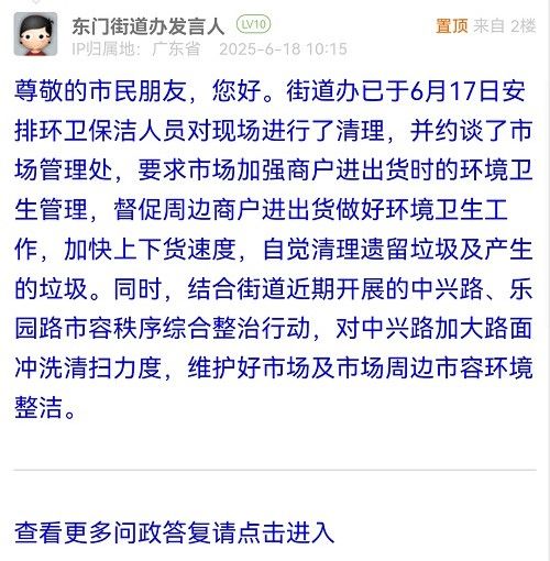 尊敬的市民朋友,您好。街道辦已于6月17日安排環(huán)衛(wèi)保潔人員對現(xiàn)場進(jìn)行了清理,并約談了市場管理處,要求市場加強(qiáng)商戶進(jìn)出貨時的環(huán)境衛(wèi)生管理,督促周邊商戶進(jìn)出貨做好環(huán)境衛(wèi)生工作,加快上下貨速度,自覺清理遺留垃圾及產(chǎn)生的垃圾。同時,結(jié)合街道近期開展的中興路、樂園路市容秩序綜合整治行動,對中興路加大路面沖洗清掃力度,維護(hù)好市場及市場周邊市容環(huán)境整潔。