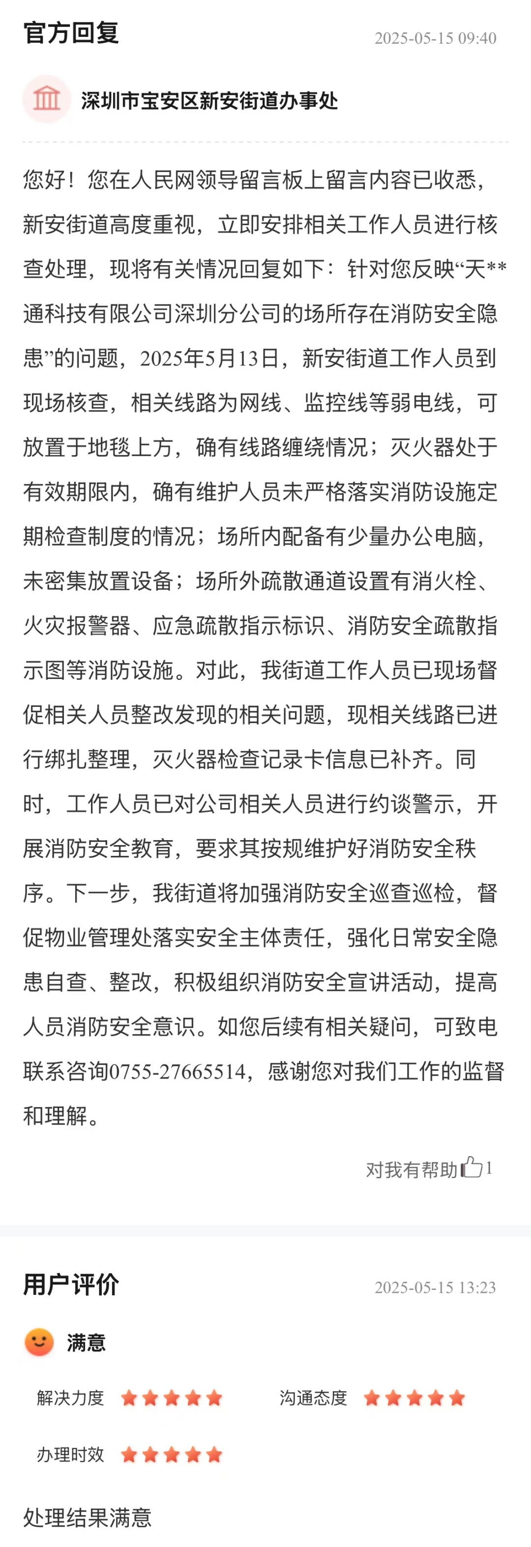 企業(yè)電氣線路混亂、滅火器維護(hù)缺位等消防隱患,直接威脅員工生命財(cái)產(chǎn)安全,更潛藏重大事故風(fēng)險。街道辦收到市民反饋后,迅速核查并高效解決現(xiàn)存問題,以“即知即改”的行動力回應(yīng)群眾關(guān)切。后續(xù)通過約談警示、安全宣教等舉措,從“治已病”轉(zhuǎn)向“防未病”,切實(shí)筑牢區(qū)域消防安全屏障,展現(xiàn)基層對安全隱患的快速治理能力,傳遞出“民生安全無小事”的責(zé)任擔(dān)當(dāng),獲得網(wǎng)民的五星好評。