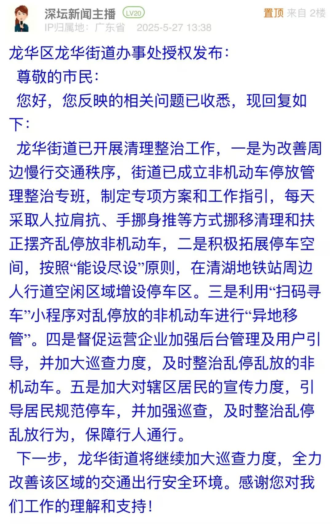 案例點(diǎn)評:地鐵口電動車與共享單車堆積,既阻礙行人通行,更影響區(qū)域交通秩序與城市形象。龍華街道辦接訴后迅速響應(yīng),成立專項(xiàng)整治專班,通過每日清理扶正、增設(shè)停車區(qū)、“掃碼尋車”移管、督促企業(yè)巡查及居民宣傳引導(dǎo)等多維度舉措,破解亂停難題,以“疏堵結(jié)合”的治理智慧,快速行動,綜合施策,為改善區(qū)域交通環(huán)境提供了務(wù)實(shí)范本。