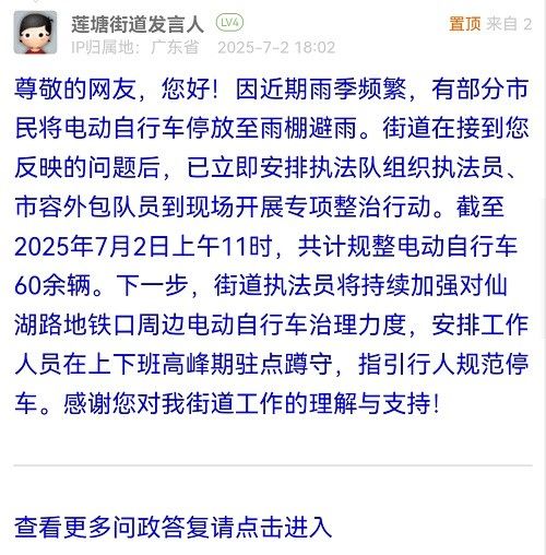 尊敬的網(wǎng)友,您好!因近期雨季頻繁,有部分市民將電動(dòng)自行車停放至雨棚避雨。街道在接到您反映的問題后,已立即安排執(zhí)法隊(duì)組織執(zhí)法員、市容外包隊(duì)員到現(xiàn)場(chǎng)開展專項(xiàng)整治行動(dòng)。截至2025年7月2日上午11時(shí),共計(jì)規(guī)整電動(dòng)自行車60余輛。下一步,街道執(zhí)法員將持續(xù)加強(qiáng)對(duì)仙湖路地鐵口周邊電動(dòng)自行車治理力度,安排工作人員在上下班高峰期駐點(diǎn)蹲守,指引行人規(guī)范停車。感謝您對(duì)我街道工作的理解與支持!