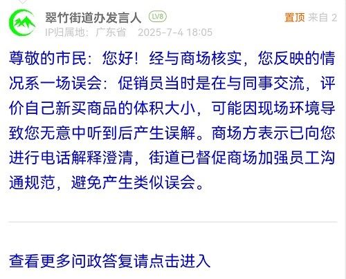 尊敬的市民:您好!經(jīng)與商場(chǎng)核實(shí),您反映的情況系一場(chǎng)誤會(huì):促銷員當(dāng)時(shí)是在與同事交流,評(píng)價(jià)自己新買商品的體積大小,可能因現(xiàn)場(chǎng)環(huán)境導(dǎo)致您無意中聽到后產(chǎn)生誤解。商場(chǎng)方表示已向您進(jìn)行電話解釋澄清,街道已督促商場(chǎng)加強(qiáng)員工溝通規(guī)范,避免產(chǎn)生類似誤會(huì)。