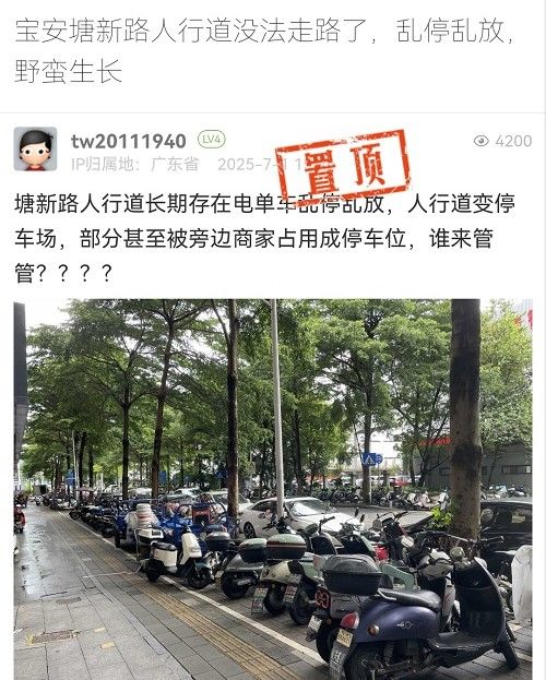 4. 帖文《寶安塘新路人行道沒法走路了,亂停亂放,野蠻生長》