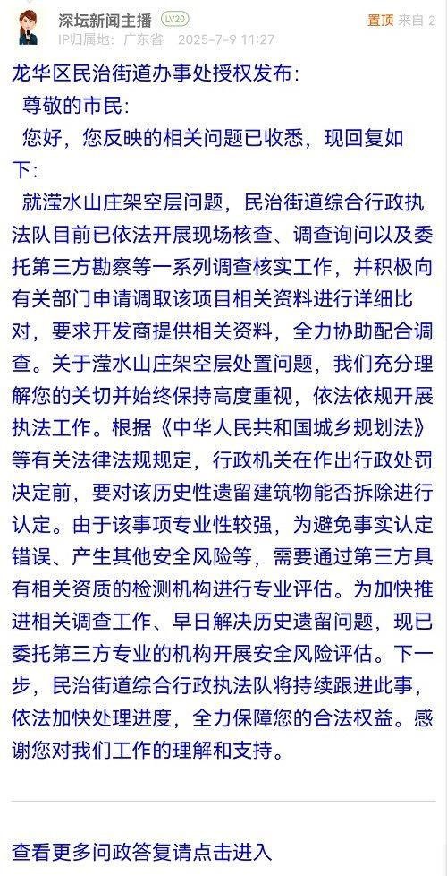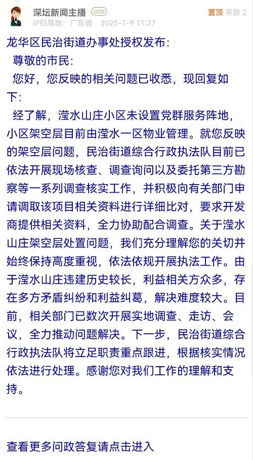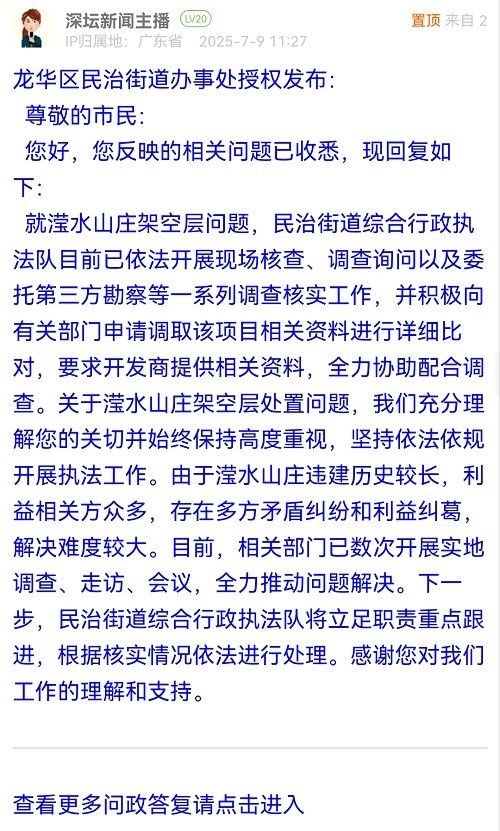 就瀅水山莊架空層問題,民治街道綜合行政執(zhí)法隊(duì)目前已依法開展現(xiàn)場(chǎng)核查、調(diào)查詢問以及委托第三方勘察等一系列調(diào)查核實(shí)工作,并積極向有關(guān)部門申請(qǐng)調(diào)取該項(xiàng)目相關(guān)資料進(jìn)行詳細(xì)比對(duì),要求開發(fā)商提供相關(guān)資料,全力協(xié)助配合調(diào)查。關(guān)于瀅水山莊架空層處置問題,我們充分理解您的關(guān)切并始終保持高度重視,堅(jiān)持依法依規(guī)開展執(zhí)法工作。由于瀅水山莊違建歷史較長,利益相關(guān)方眾多,存在多方矛盾糾紛和利益糾葛,解決難度較大。目前,相關(guān)部門已數(shù)次開展實(shí)地調(diào)查、走訪、會(huì)議,全力推動(dòng)問題解決。下一步,民治街道綜合行政執(zhí)法隊(duì)將立足職責(zé)重點(diǎn)跟進(jìn),根據(jù)核實(shí)情況依法進(jìn)行處理。感謝您對(duì)我們工作的理解和支持。