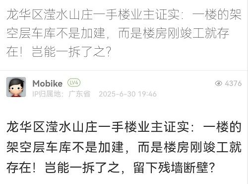 14. 帖文《龍華區(qū)瀅水山莊一手樓業(yè)主證實(shí):一樓的架空層車庫不是加建,而是樓房剛竣工就存在!豈能一拆了之?》