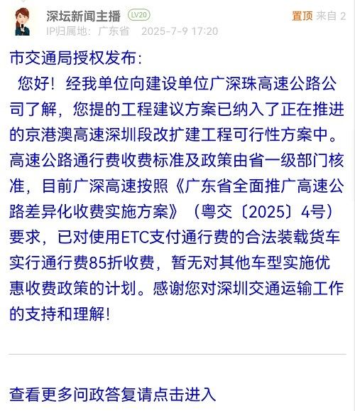您好!經(jīng)我單位向建設(shè)單位廣深珠高速公路公司了解,您提的工程建議方案已納入了正在推進(jìn)的京港澳高速深圳段改擴(kuò)建工程可行性方案中。高速公路通行費(fèi)收費(fèi)標(biāo)準(zhǔn)及政策由省一級(jí)部門核準(zhǔn),目前廣深高速按照《廣東省全面推廣高速公路差異化收費(fèi)實(shí)施方案》(粵交〔2025〕4號(hào))要求,已對(duì)使用ETC支付通行費(fèi)的合法裝載貨車實(shí)行通行費(fèi)85折收費(fèi),暫無對(duì)其他車型實(shí)施優(yōu)惠收費(fèi)政策的計(jì)劃。感謝您對(duì)深圳交通運(yùn)輸工作的支持和理解!