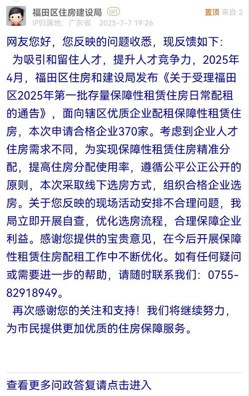 為吸引和留住人才,提升人才競(jìng)爭(zhēng)力,2025年4月,福田區(qū)住房和建設(shè)局發(fā)布《關(guān)于受理福田區(qū)2025年第一批存量保障性租賃住房日常配租的通告》,面向轄區(qū)優(yōu)質(zhì)企業(yè)配租保障性租賃住房,本次申請(qǐng)合格企業(yè)370家。考慮到企業(yè)人才住房需求不同,為實(shí)現(xiàn)保障性租賃住房精準(zhǔn)分配,提高住房分配使用率,遵循公平公正公開的原則,本次采取線下選房方式,組織合格企業(yè)選房。關(guān)于您反映的現(xiàn)場(chǎng)活動(dòng)安排不合理問題,我局立即開展自查,優(yōu)化選房流程,合理保障企業(yè)利益。感謝您提供的寶貴意見,在今后開展保障性租賃住房配租工作中不斷優(yōu)化。如有任何疑問或需要進(jìn)一步的幫助,請(qǐng)隨時(shí)聯(lián)系我們:0755-82918949。