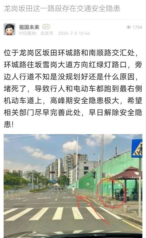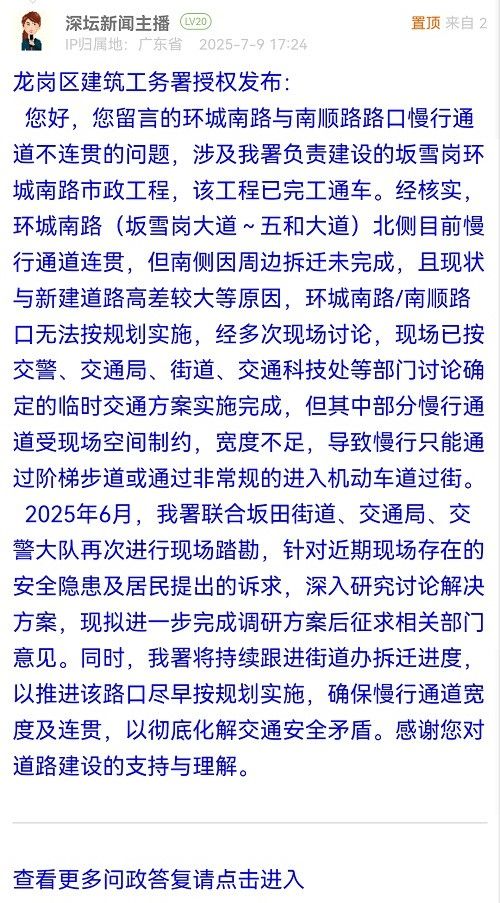 2025年6月,我署聯(lián)合坂田街道、交通局、交警大隊(duì)再次進(jìn)行現(xiàn)場(chǎng)踏勘,針對(duì)近期現(xiàn)場(chǎng)存在的安全隱患及居民提出的訴求,深入研究討論解決方案,現(xiàn)擬進(jìn)一步完成調(diào)研方案后征求相關(guān)部門意見。同時(shí),我署將持續(xù)跟進(jìn)街道辦拆遷進(jìn)度,以推進(jìn)該路口盡早按規(guī)劃實(shí)施,確保慢行通道寬度及連貫,以徹底化解交通安全矛盾。感謝您對(duì)道路建設(shè)的支持與理解。
