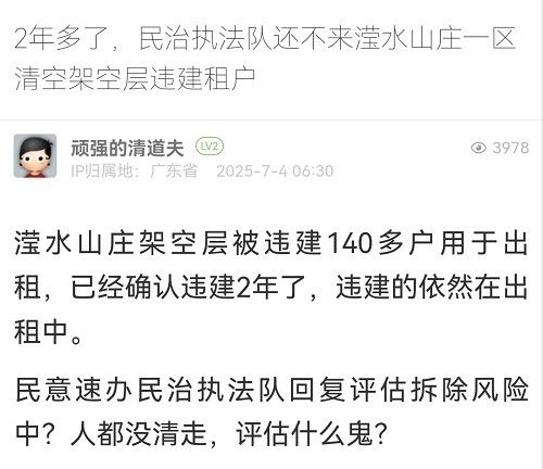 16. 帖文《2年多了,民治執(zhí)法隊(duì)還不來瀅水山莊一區(qū)清空架空層違建租戶》
