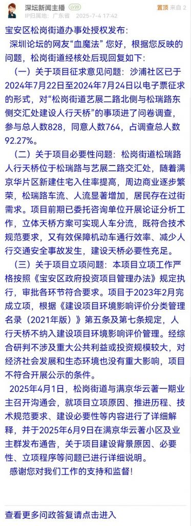 2025年4月1日,松崗街道與滿京華云著一期業(yè)主召開溝通會(huì),就項(xiàng)目立項(xiàng)原因、推進(jìn)歷程、技術(shù)規(guī)范要求、建設(shè)必要性等內(nèi)容進(jìn)行了詳細(xì)解釋,并于2025年6月9日在滿京華云著小區(qū)及業(yè)主群發(fā)布通告,關(guān)于項(xiàng)目建設(shè)背景原因、必要性、立項(xiàng)程序等問題已進(jìn)行詳細(xì)說明。