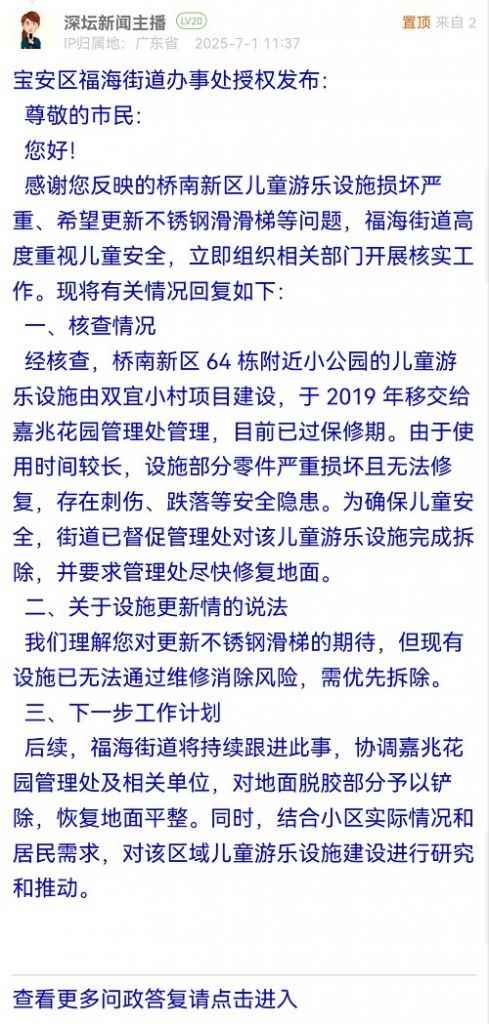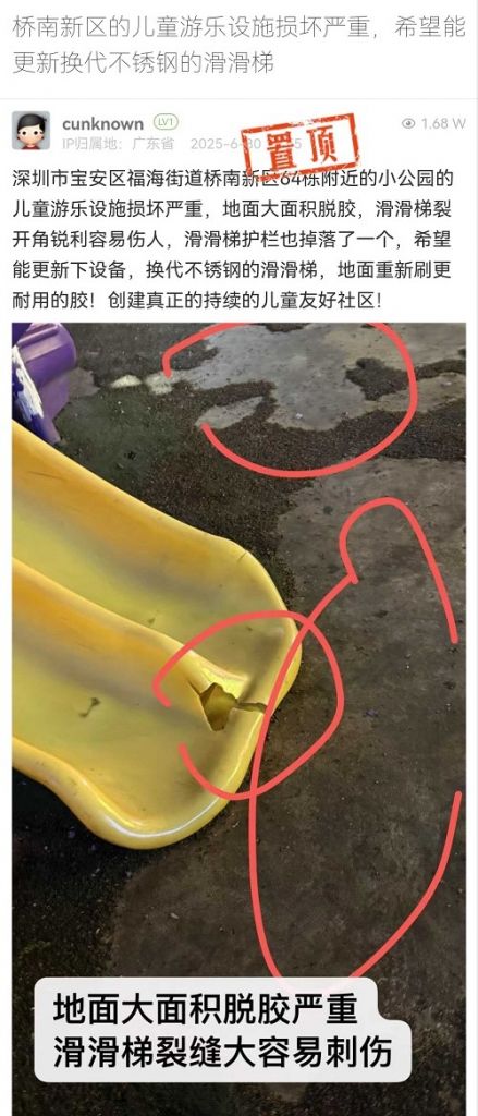 3. 帖文《橋南新區(qū)的兒童游樂設(shè)施損壞嚴(yán)重,希望能更新?lián)Q代不銹鋼的滑滑梯》
