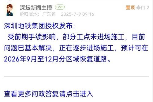 受前期手續(xù)影響,部分工點(diǎn)未進(jìn)場(chǎng)施工,目前問題已基本解決,正在逐步進(jìn)場(chǎng)施工,預(yù)計(jì)可在2026年9月至12月分區(qū)域恢復(fù)道路。