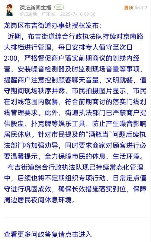 布吉街道綜合行政執(zhí)法隊(duì)現(xiàn)已持續(xù)常態(tài)化管理中,后續(xù)也將不定期組織專項(xiàng)行動(dòng)、日常定點(diǎn)值守進(jìn)行鞏固成效,確保長效措施落實(shí)到位,保障周邊居民夜間休息環(huán)境。