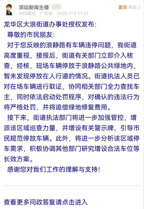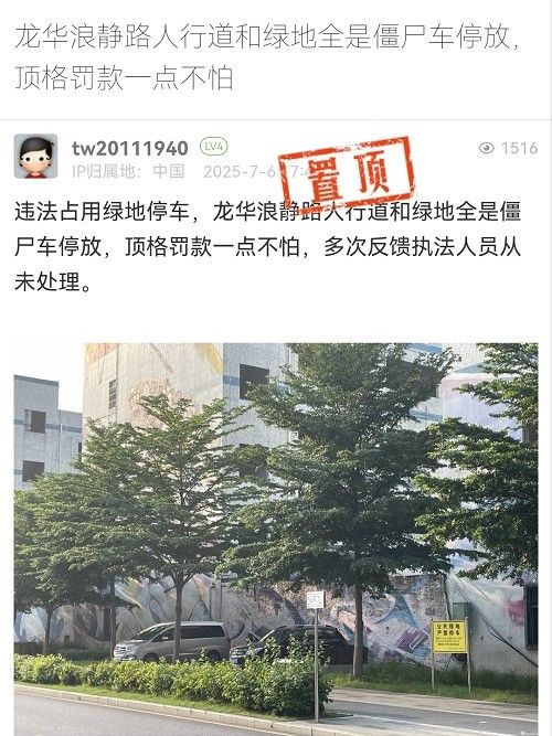 17. 帖文《龍華浪靜路人行道和綠地全是僵尸車停放,頂格罰款一點(diǎn)不怕》