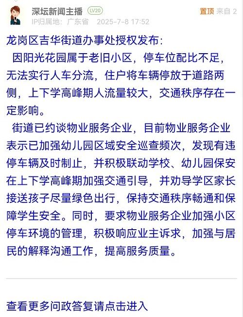 街道已約談物業(yè)服務(wù)企業(yè),目前物業(yè)服務(wù)企業(yè)表示已加強(qiáng)幼兒園區(qū)域安全巡查頻次,發(fā)現(xiàn)有違停車輛及時(shí)制止,并積極聯(lián)動(dòng)學(xué)校、幼兒園保安在上下學(xué)高峰期加強(qiáng)交通引導(dǎo),并勸導(dǎo)學(xué)區(qū)家長接送孩子盡量綠色出行,保持交通秩序暢通和保障學(xué)生安全。同時(shí),要求物業(yè)服務(wù)企業(yè)加強(qiáng)小區(qū)停車環(huán)境的管理,積極響應(yīng)業(yè)主訴求,加強(qiáng)與居民的解釋溝通工作,提高服務(wù)質(zhì)量。