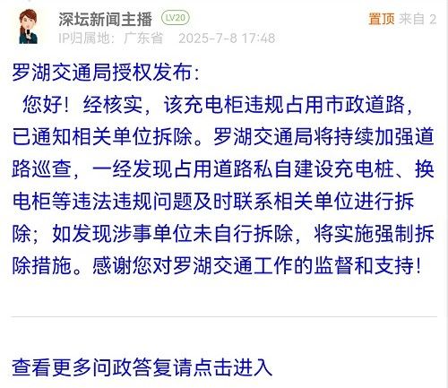 您好!經(jīng)核實(shí),該充電柜違規(guī)占用市政道路,已通知相關(guān)單位拆除。羅湖交通局將持續(xù)加強(qiáng)道路巡查,一經(jīng)發(fā)現(xiàn)占用道路私自建設(shè)充電樁、換電柜等違法違規(guī)問題及時(shí)聯(lián)系相關(guān)單位進(jìn)行拆除;如發(fā)現(xiàn)涉事單位未自行拆除,將實(shí)施強(qiáng)制拆除措施。感謝您對(duì)羅湖交通工作的監(jiān)督和支持!