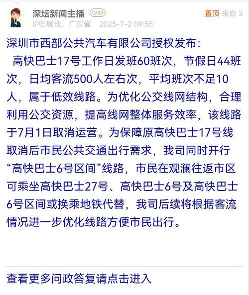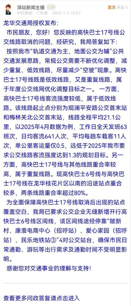 高快巴士17號(hào)工作日發(fā)班60班次,節(jié)假日44班次,日均客流500人左右次,平均班次不足10人,屬于低效線路。為優(yōu)化公交線網(wǎng)結(jié)構(gòu),合理利用公交資源,提高線網(wǎng)整體服務(wù)效率,該線路于7月1日取消運(yùn)營。為保障原高快巴士17號(hào)線取消后市民公共交通出行需求,我司同時(shí)開行“高快巴士6號(hào)區(qū)間”線路,市民在觀瀾往返市區(qū)可乘坐高快巴士27號(hào)、高快巴士6號(hào)及高快巴士6號(hào)區(qū)間或換乘地鐵代替,我司后續(xù)將根據(jù)客流情況進(jìn)一步優(yōu)化線路方便市民出行。