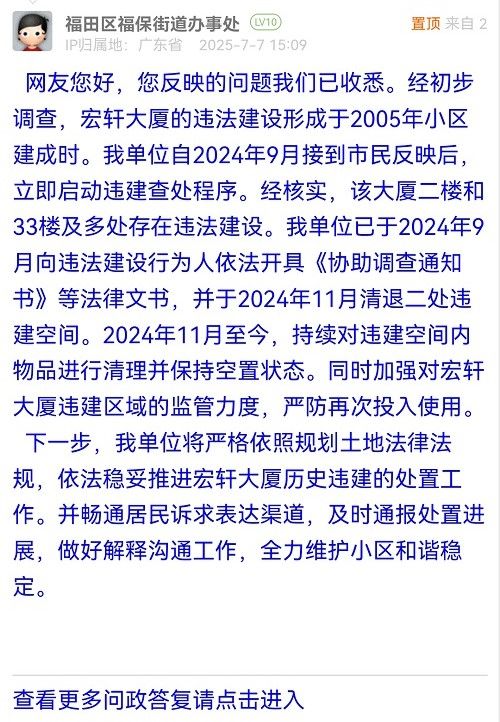 網(wǎng)友您好,您反映的問題我們已收悉。經(jīng)初步調(diào)查,宏軒大廈的違法建設(shè)形成于2005年小區(qū)建成時(shí)。我單位自2024年9月接到市民反映后,立即啟動(dòng)違建查處程序。經(jīng)核實(shí),該大廈二樓和33樓及多處存在違法建設(shè)。我單位已于2024年9月向違法建設(shè)行為人依法開具《協(xié)助調(diào)查通知書》等法律文書,并于2024年11月清退二處違建空間。2024年11月至今,持續(xù)對(duì)違建空間內(nèi)物品進(jìn)行清理并保持空置狀態(tài)。同時(shí)加強(qiáng)對(duì)宏軒大廈違建區(qū)域的監(jiān)管力度,嚴(yán)防再次投入使用。