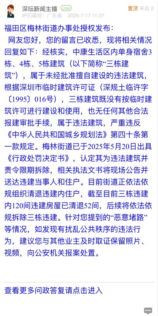 網(wǎng)友您好,您的留言已收悉,現(xiàn)將相關(guān)情況回復(fù)如下:經(jīng)核實,中康生活區(qū)內(nèi)單身宿舍3棟、4棟、5棟建筑(以下簡稱“三棟建筑”),屬于未經(jīng)批準(zhǔn)擅自建設(shè)的違法建筑,根據(jù)深圳市臨時建筑許可證(深規(guī)土臨許字〔1995〕016號),三棟建筑既沒有按臨時建筑許可進(jìn)行建設(shè)和使用,也無任何其他合法報建審批手續(xù),屬于違法建筑,嚴(yán)重違反《中華人民共和國城鄉(xiāng)規(guī)劃法》第四十條第一款規(guī)定。梅林街道已于2025年5月20日出具《行政處罰決定書》,認(rèn)定其為違法建筑并責(zé)令限期拆除,相關(guān)執(zhí)法文書將現(xiàn)場公告并送達(dá)違建當(dāng)事人和住戶。目前街道正依法依規(guī)組織清退違建內(nèi)住戶,截至目前三棟違建內(nèi)120間違建房屋已清退52間,后續(xù)將依法依規(guī)拆除三棟違建。針對您提到的“惡意堵路”等情況,如發(fā)現(xiàn)有擾亂公共秩序的違法行為,建議您與其他業(yè)主及時取證保留照片、視頻,向公安機關(guān)報案處置。