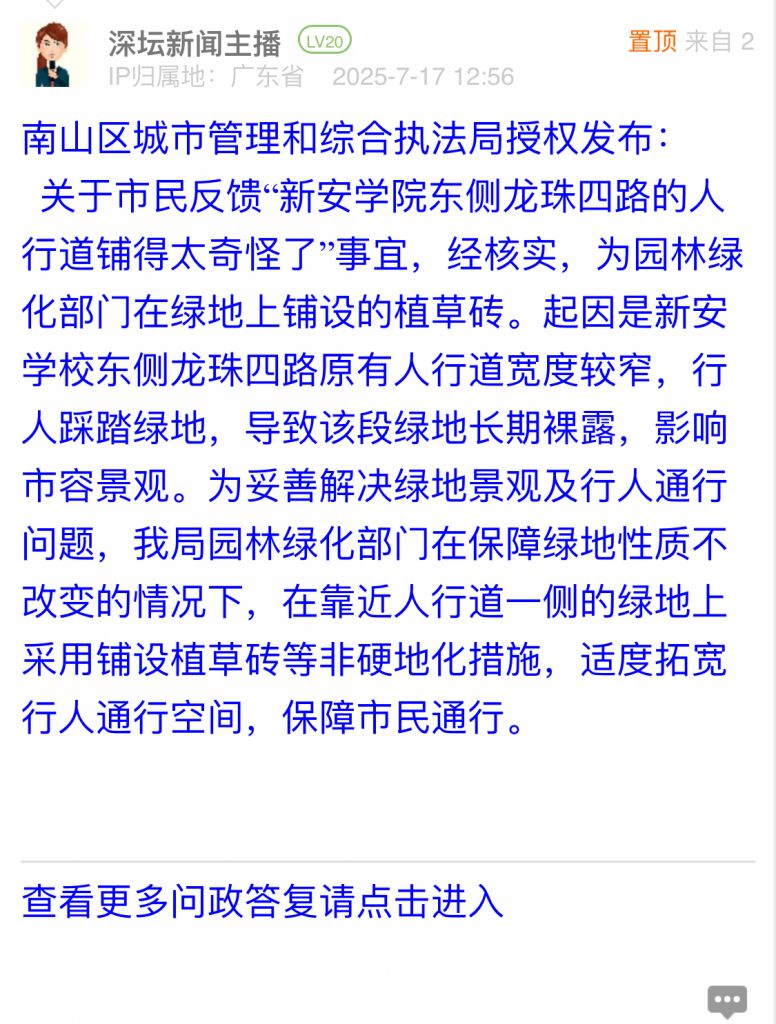 關(guān)于市民反饋“新安學(xué)院東側(cè)龍珠四路的人行道鋪得太奇怪了”事宜,經(jīng)核實,為園林綠化部門在綠地上鋪設(shè)的植草磚。起因是新安學(xué)校東側(cè)龍珠四路原有人行道寬度較窄,行人踩踏綠地,導(dǎo)致該段綠地長期裸露,影響市容景觀。為妥善解決綠地景觀及行人通行問題,我局園林綠化部門在保障綠地性質(zhì)不改變的情況下,在靠近人行道一側(cè)的綠地上采用鋪設(shè)植草磚等非硬地化措施,適度拓寬行人通行空間,保障市民通行。