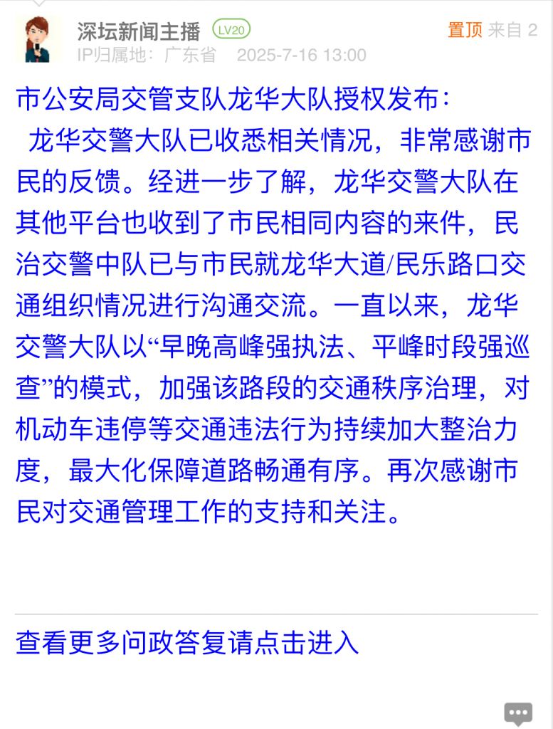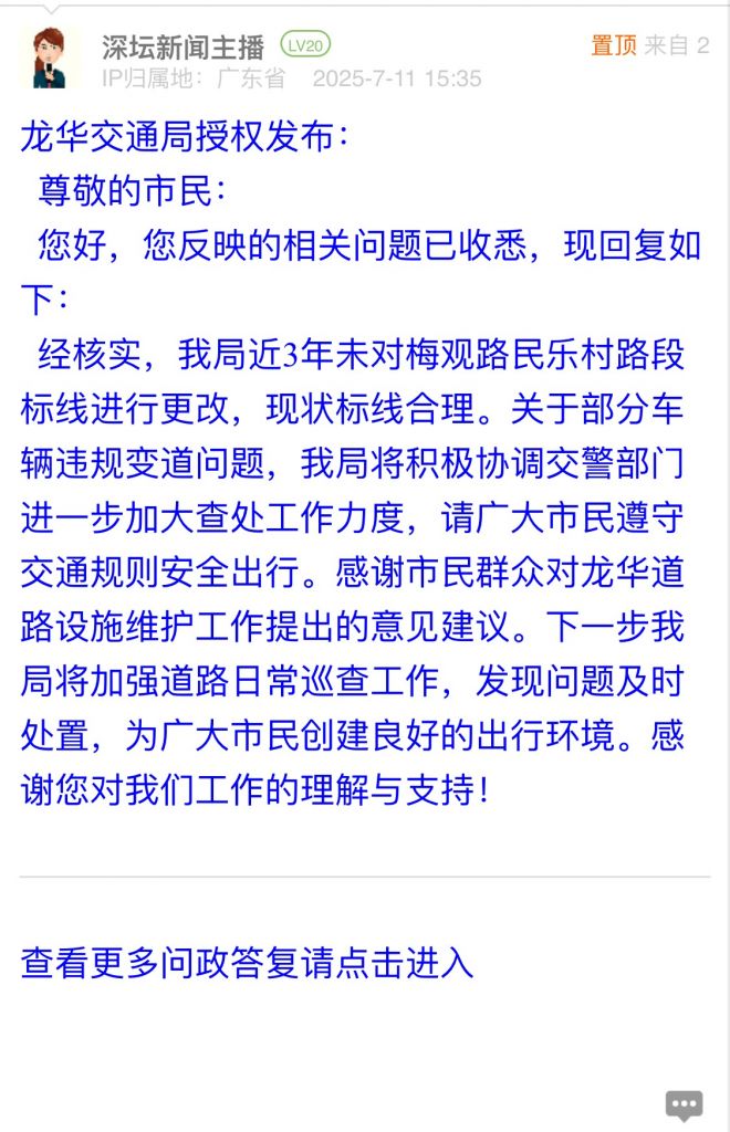 龍華交警大隊已收悉相關(guān)情況,非常感謝市民的反饋。經(jīng)進(jìn)一步了解,龍華交警大隊在其他平臺也收到了市民相同內(nèi)容的來件,民治交警中隊已與市民就龍華大道/民樂路口交通組織情況進(jìn)行溝通交流。一直以來,龍華交警大隊以“早晚高峰強執(zhí)法、平峰時段強巡查”的模式,加強該路段的交通秩序治理,對機動車違停等交通違法行為持續(xù)加大整治力度,最大化保障道路暢通有序。再次感謝市民對交通管理工作的支持和關(guān)注。
