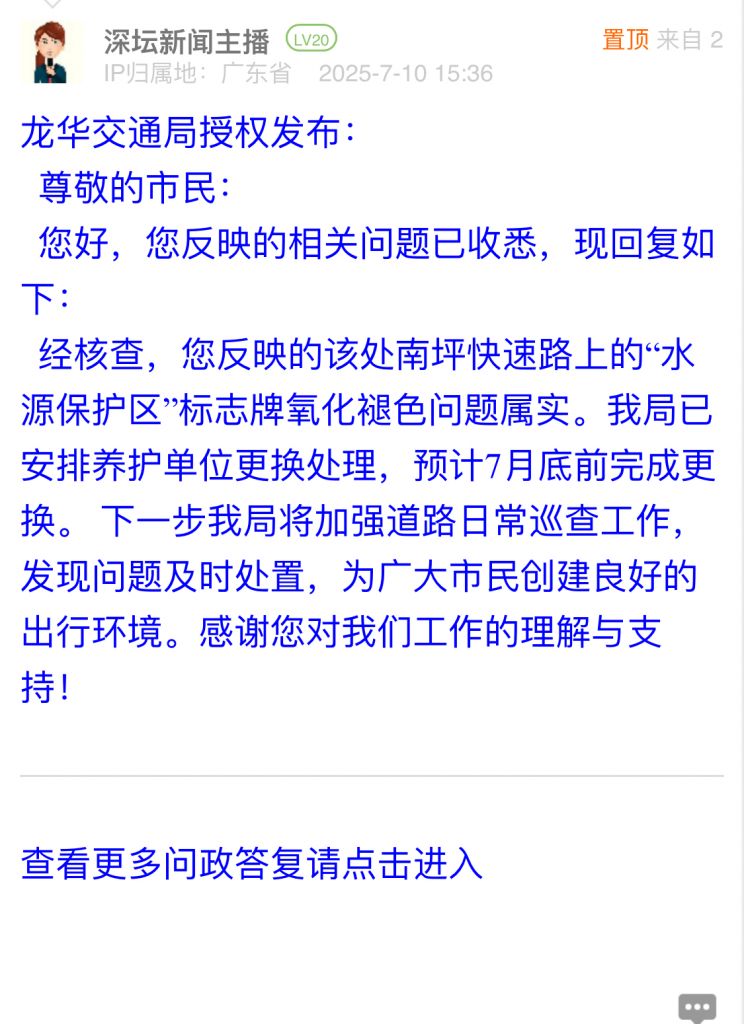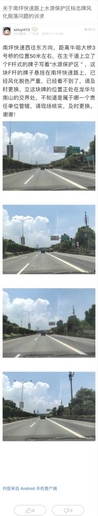 5. 帖文《關(guān)于南坪快速路上水源保護(hù)區(qū)標(biāo)志牌風(fēng)化脫落問題的訴求》
