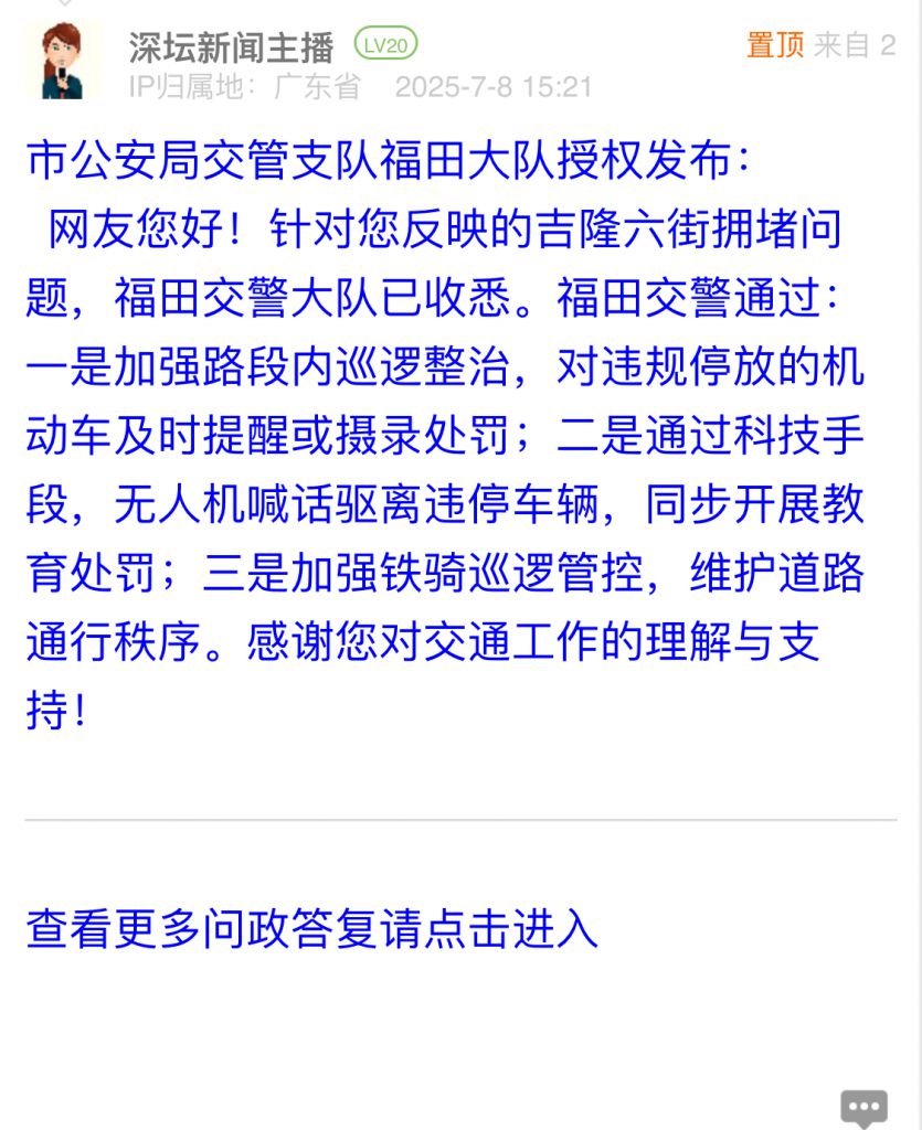 網(wǎng)友您好!針對您反映的吉隆六街擁堵問題,福田交警大隊已收悉。福田交警通過:一是加強路段內(nèi)巡邏整治,對違規(guī)停放的機動車及時提醒或攝錄處罰;二是通過科技手段,無人機喊話驅(qū)離違停車輛,同步開展教育處罰;三是加強鐵騎巡邏管控,維護(hù)道路通行秩序。感謝您對交通工作的理解與支持!