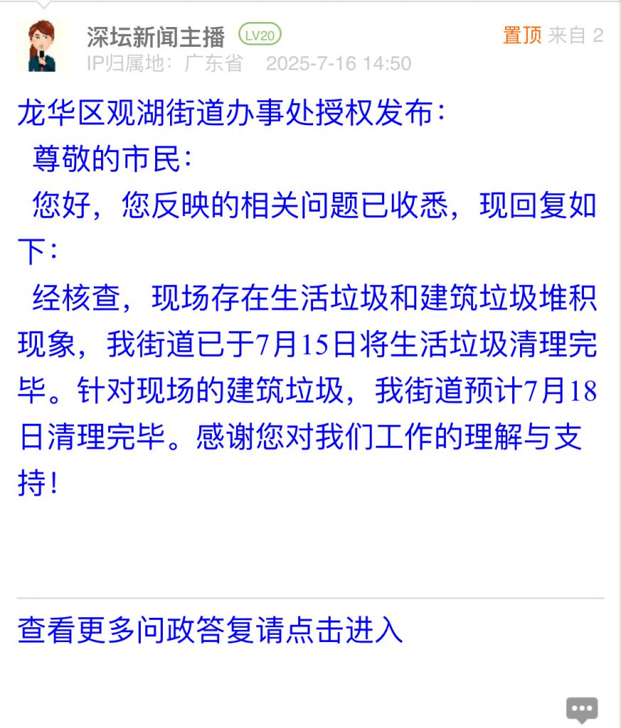 經(jīng)核查,現(xiàn)場存在生活垃圾和建筑垃圾堆積現(xiàn)象,我街道已于7月15日將生活垃圾清理完畢。針對現(xiàn)場的建筑垃圾,我街道預(yù)計7月18日清理完畢。感謝您對我們工作的理解與支持!