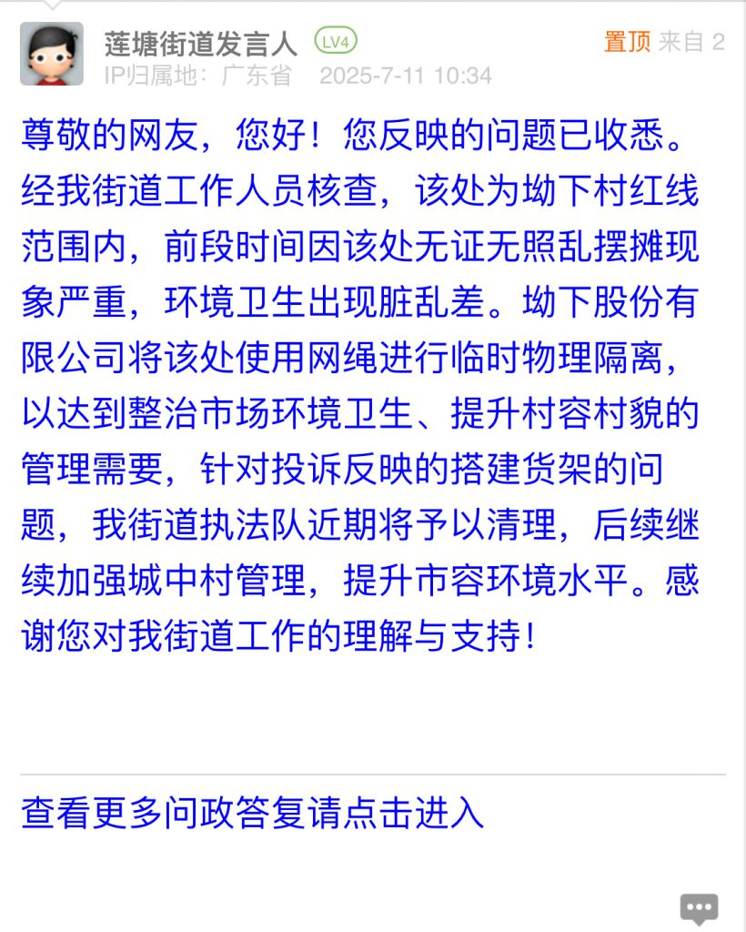尊敬的網(wǎng)友,您好!您反映的問題已收悉。經(jīng)我街道工作人員核查,該處為坳下村紅線范圍內(nèi),前段時間因該處無證無照亂擺攤現(xiàn)象嚴(yán)重,環(huán)境衛(wèi)生出現(xiàn)臟亂差。坳下股份有限公司將該處使用網(wǎng)繩進(jìn)行臨時物理隔離,以達(dá)到整治市場環(huán)境衛(wèi)生、提升村容村貌的管理需要,針對投訴反映的搭建貨架的問題,我街道執(zhí)法隊近期將予以清理,后續(xù)繼續(xù)加強城中村管理,提升市容環(huán)境水平。感謝您對我街道工作的理解與支持!