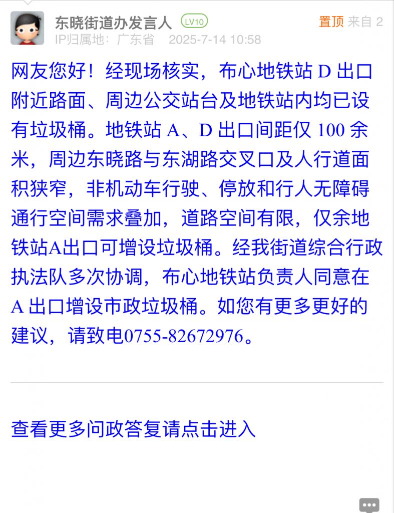 網(wǎng)友您好!經(jīng)現(xiàn)場核實,布心地鐵站 D 出口附近路面、周邊公交站臺及地鐵站內(nèi)均已設(shè)有垃圾桶。地鐵站 A、D 出口間距僅 100 余米,周邊東曉路與東湖路交叉口及人行道面積狹窄,非機動車行駛、停放和行人無障礙通行空間需求疊加,道路空間有限,僅余地鐵站A出口可增設(shè)垃圾桶。經(jīng)我街道綜合行政執(zhí)法隊多次協(xié)調(diào),布心地鐵站負(fù)責(zé)人同意在 A 出口增設(shè)市政垃圾桶。如您有更多更好的建議,請致電0755-82672976。