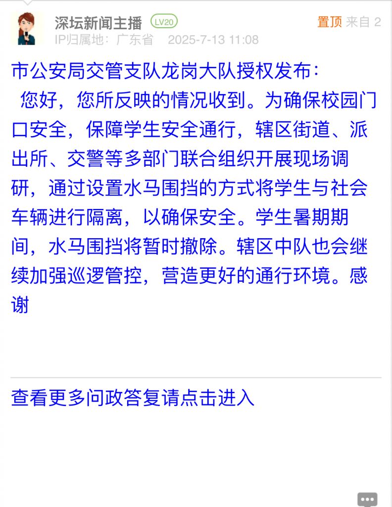 您好,您所反映的情況收到。為確保校園門口安全,保障學(xué)生安全通行,轄區(qū)街道、派出所、交警等多部門聯(lián)合組織開展現(xiàn)場調(diào)研,通過設(shè)置水馬圍擋的方式將學(xué)生與社會車輛進(jìn)行隔離,以確保安全。學(xué)生暑期期間,水馬圍擋將暫時撤除。轄區(qū)中隊也會繼續(xù)加強巡邏管控,營造更好的通行環(huán)境。感謝