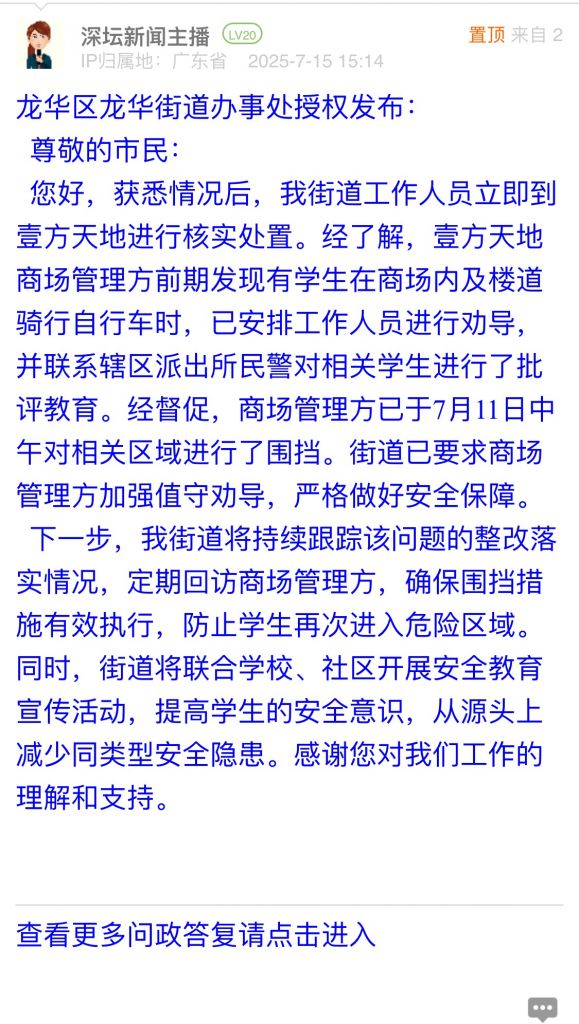 您好,獲悉情況后,我街道工作人員立即到壹方天地進(jìn)行核實處置。經(jīng)了解,壹方天地商場管理方前期發(fā)現(xiàn)有學(xué)生在商場內(nèi)及樓道騎行自行車時,已安排工作人員進(jìn)行勸導(dǎo),并聯(lián)系轄區(qū)派出所民警對相關(guān)學(xué)生進(jìn)行了批評教育。經(jīng)督促,商場管理方已于7月11日中午對相關(guān)區(qū)域進(jìn)行了圍擋。街道已要求商場管理方加強值守勸導(dǎo),嚴(yán)格做好安全保障。