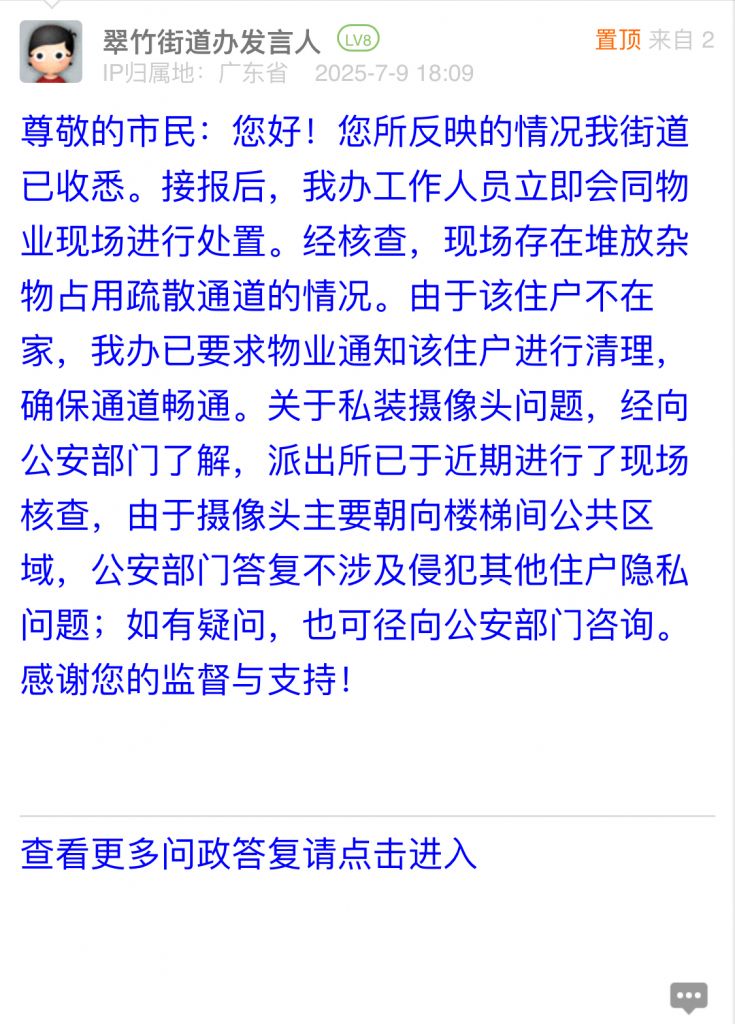 尊敬的市民:您好!您所反映的情況我街道已收悉。接報后,我辦工作人員立即會同物業(yè)現(xiàn)場進(jìn)行處置。經(jīng)核查,現(xiàn)場存在堆放雜物占用疏散通道的情況。由于該住戶不在家,我辦已要求物業(yè)通知該住戶進(jìn)行清理,確保通道暢通。關(guān)于私裝攝像頭問題,經(jīng)向公安部門了解,派出所已于近期進(jìn)行了現(xiàn)場核查,由于攝像頭主要朝向樓梯間公共區(qū)域,公安部門答復(fù)不涉及侵犯其他住戶隱私問題;如有疑問,也可徑向公安部門咨詢。感謝您的監(jiān)督與支持!