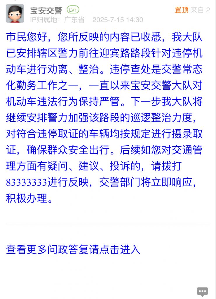 市民您好,您所反映的內(nèi)容已收悉,我大隊已安排轄區(qū)警力前往迎賓路路段針對違停機動車進(jìn)行勸離、整治。違停查處是交警常態(tài)化勤務(wù)工作之一,一直以來寶安交警大隊對機動車違法行為保持嚴(yán)管。下一步我大隊將繼續(xù)安排警力加強該路段的巡邏整治力度,對符合違停取證的車輛均按規(guī)定進(jìn)行攝錄取證,確保群眾安全出行。后續(xù)如您對交通管理方面有疑問、建議、投訴的,請撥打83333333進(jìn)行反映,交警部門將立即響應(yīng),積極辦理。