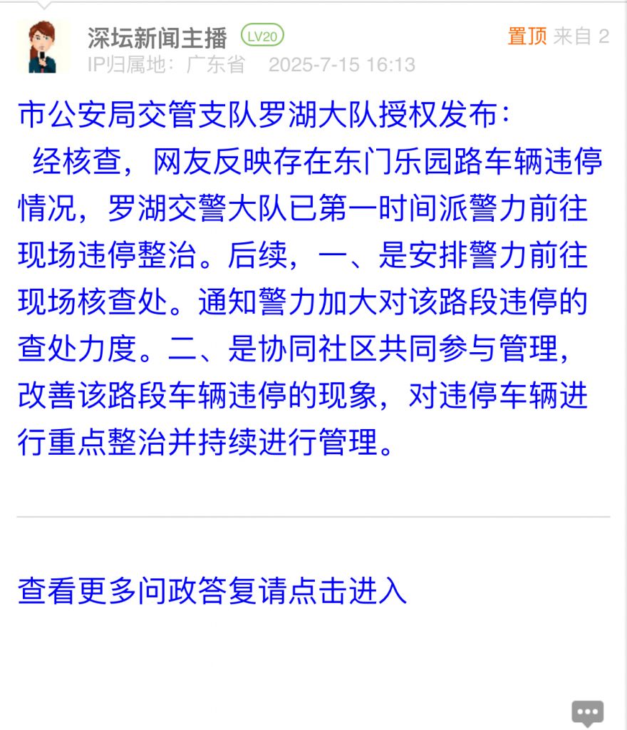 經(jīng)核查,網(wǎng)友反映存在東門樂園路車輛違停情況,羅湖交警大隊已第一時間派警力前往現(xiàn)場違停整治。后續(xù),一、是安排警力前往現(xiàn)場核查處。通知警力加大對該路段違停的查處力度。二、是協(xié)同社區(qū)共同參與管理,改善該路段車輛違停的現(xiàn)象,對違停車輛進(jìn)行重點整治并持續(xù)進(jìn)行管理。