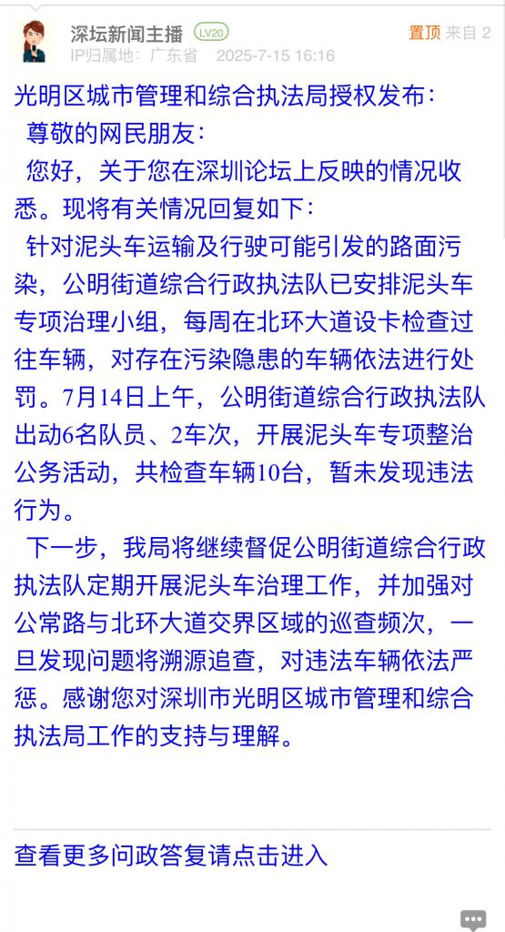下一步,我局將繼續(xù)督促公明街道綜合行政執(zhí)法隊定期開展泥頭車治理工作,并加強對公常路與北環(huán)大道交界區(qū)域的巡查頻次,一旦發(fā)現(xiàn)問題將溯源追查,對違法車輛依法嚴(yán)懲。感謝您對深圳市光明區(qū)城市管理和綜合執(zhí)法局工作的支持與理解。