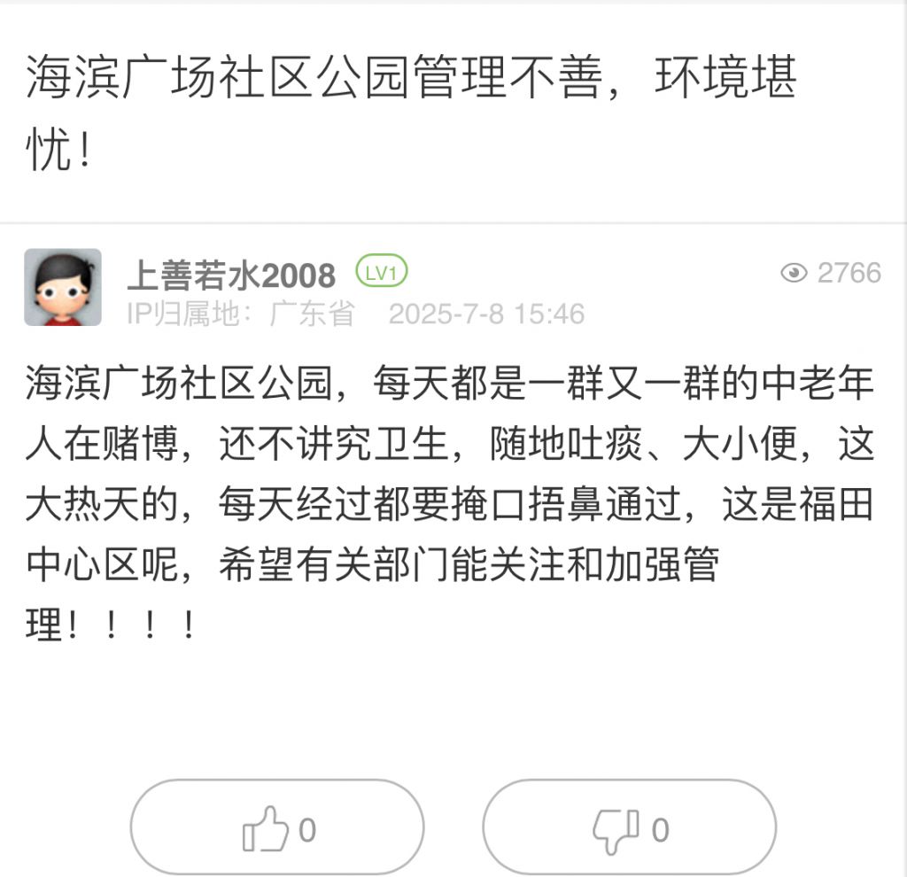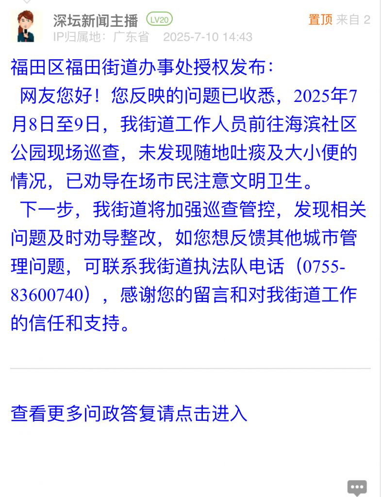 網(wǎng)友您好!您反映的問題已收悉,2025年7月8日至9日,我街道工作人員前往海濱社區(qū)公園現(xiàn)場巡查,未發(fā)現(xiàn)隨地吐痰及大小便的情況,已勸導(dǎo)在場市民注意文明衛(wèi)生。
