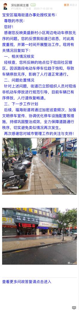 經(jīng)核查,您所反映的地點位于稔田社區(qū)轄區(qū)。因該路段電動車停車位趨于飽和,導(dǎo)致車輛停放無序,影響了人行道正常通行。