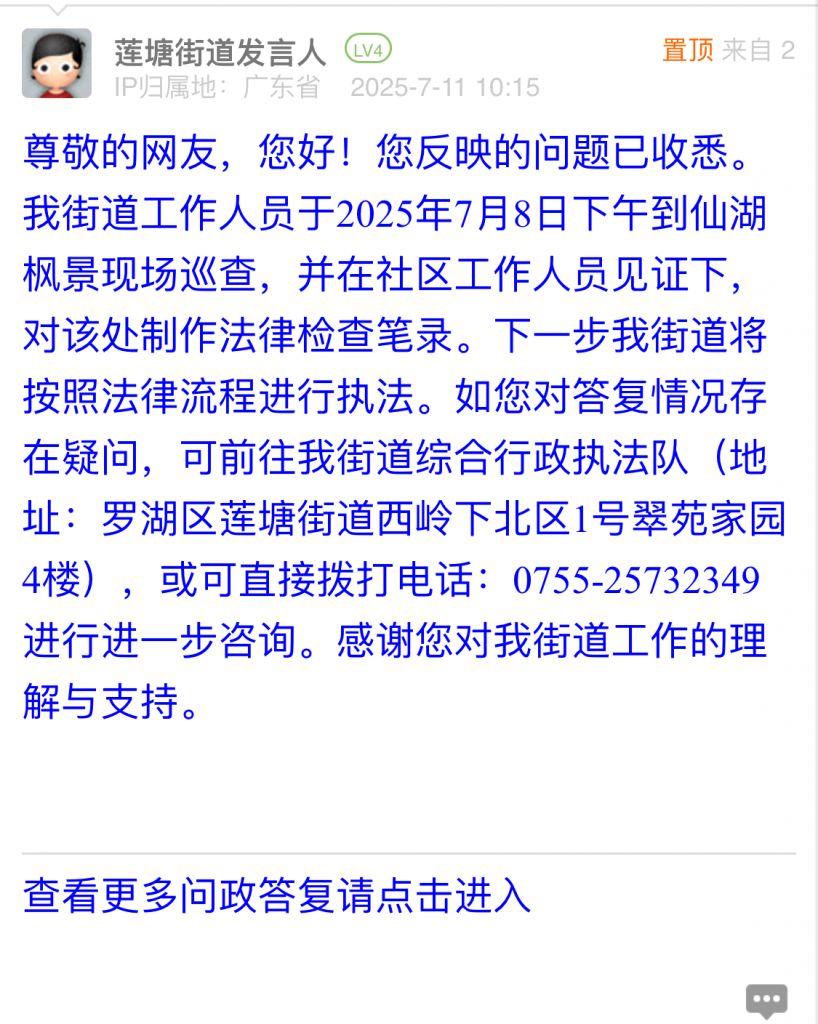 尊敬的網(wǎng)友,您好!您反映的問題已收悉。我街道工作人員于2025年7月8日下午到仙湖楓景現(xiàn)場巡查,并在社區(qū)工作人員見證下,對該處制作法律檢查筆錄。下一步我街道將按照法律流程進(jìn)行執(zhí)法。如您對答復(fù)情況存在疑問,可前往我街道綜合行政執(zhí)法隊(地址:羅湖區(qū)蓮塘街道西嶺下北區(qū)1號翠苑家園4樓),或可直接撥打電話:0755-25732349進(jìn)行進(jìn)一步咨詢。感謝您對我街道工作的理解與支持。