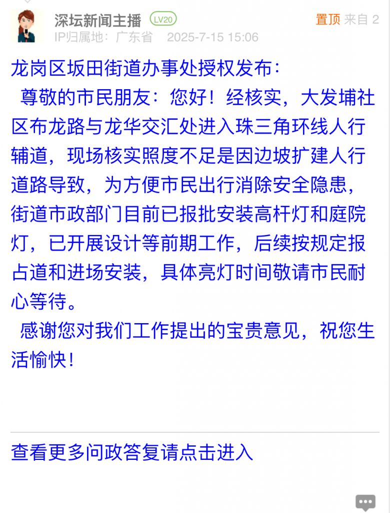 尊敬的市民朋友:您好!經(jīng)核實,大發(fā)埔社區(qū)布龍路與龍華交匯處進(jìn)入珠三角環(huán)線人行輔道,現(xiàn)場核實照度不足是因邊坡擴建人行道路導(dǎo)致,為方便市民出行消除安全隱患,街道市政部門目前已報批安裝高桿燈和庭院燈,已開展設(shè)計等前期工作,后續(xù)按規(guī)定報占道和進(jìn)場安裝,具體亮燈時間敬請市民耐心等待。
