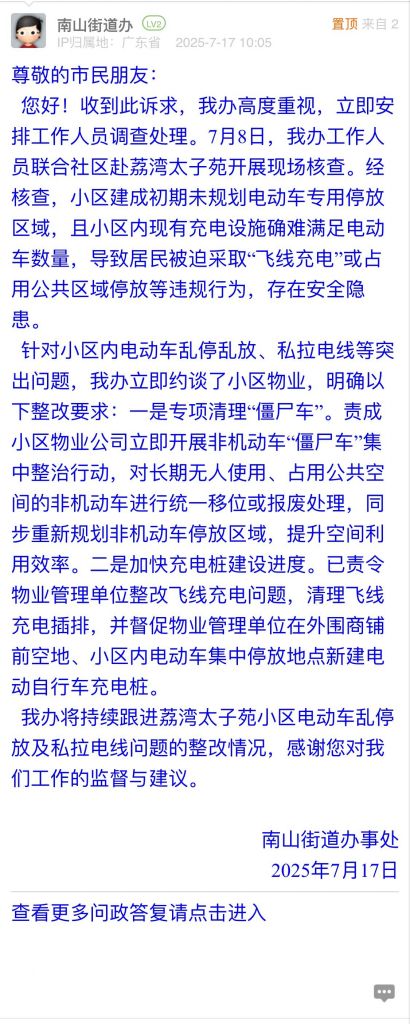我辦將持續(xù)跟進(jìn)荔灣太子苑小區(qū)電動車亂停放及私拉電線問題的整改情況,感謝您對我們工作的監(jiān)督與建議。