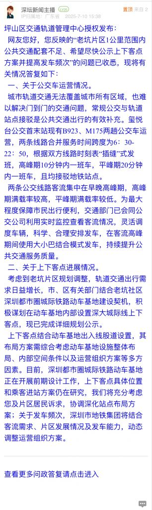 網(wǎng)友您好,您反映的“老坑片區(qū)1公里范圍內(nèi)公共交通配套不足、希望盡快公示上下客點方案并提高發(fā)車頻次”的問題已收悉,現(xiàn)將有關(guān)情況答復(fù)如下: