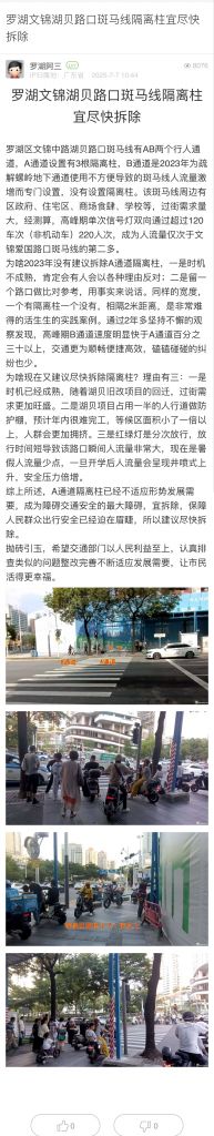 2. 帖文《羅湖文錦湖貝路口斑馬線隔離柱宜盡快拆除》