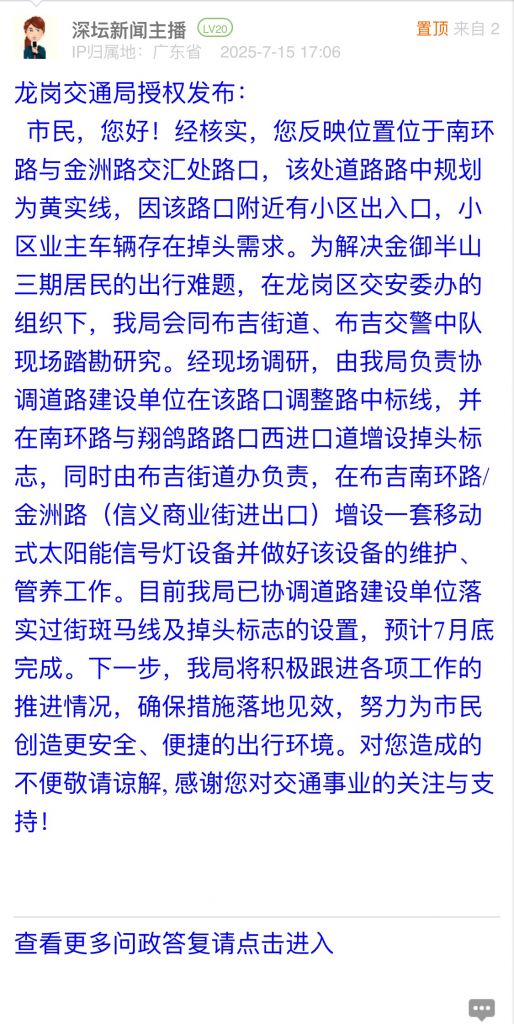 市民,您好!經(jīng)核實,您反映位置位于南環(huán)路與金洲路交匯處路口,該處道路路中規(guī)劃為黃實線,因該路口附近有小區(qū)出入口,小區(qū)業(yè)主車輛存在掉頭需求。為解決金御半山三期居民的出行難題,在龍崗區(qū)交安委辦的組織下,我局會同布吉街道、布吉交警中隊現(xiàn)場踏勘研究。經(jīng)現(xiàn)場調(diào)研,由我局負(fù)責(zé)協(xié)調(diào)道路建設(shè)單位在該路口調(diào)整路中標(biāo)線,并在南環(huán)路與翔鴿路路口西進(jìn)口道增設(shè)掉頭標(biāo)志,同時由布吉街道辦負(fù)責(zé),在布吉南環(huán)路/金洲路(信義商業(yè)街進(jìn)出口)增設(shè)一套移動式太陽能信號燈設(shè)備并做好該設(shè)備的維護(hù)、管養(yǎng)工作。目前我局已協(xié)調(diào)道路建設(shè)單位落實過街斑馬線及掉頭標(biāo)志的設(shè)置,預(yù)計7月底完成。下一步,我局將積極跟進(jìn)各項工作的推進(jìn)情況,確保措施落地見效,努力為市民創(chuàng)造更安全、便捷的出行環(huán)境。對您造成的不便敬請諒解, 感謝您對交通事業(yè)的關(guān)注與支持!