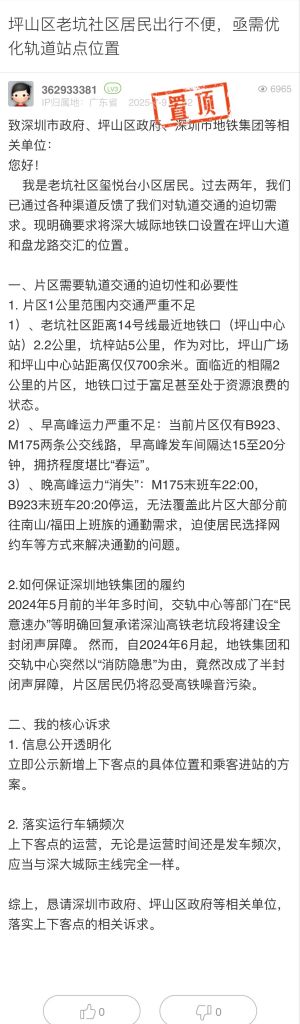 13. 帖文《坪山區(qū)老坑社區(qū)居民出行不便,亟需優(yōu)化軌道站點位置》