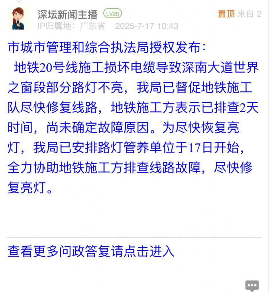 地鐵20號線施工損壞電纜導(dǎo)致深南大道世界之窗段部分路燈不亮,我局已督促地鐵施工隊盡快修復(fù)線路,地鐵施工方表示已排查2天時間,尚未確定故障原因。為盡快恢復(fù)亮燈,我局已安排路燈管養(yǎng)單位于17日開始,全力協(xié)助地鐵施工方排查線路故障,盡快修復(fù)亮燈。